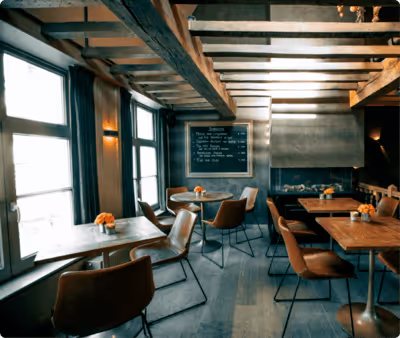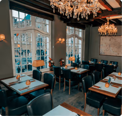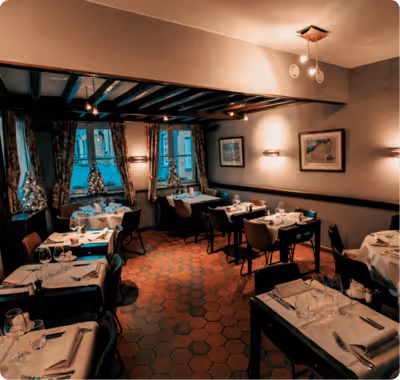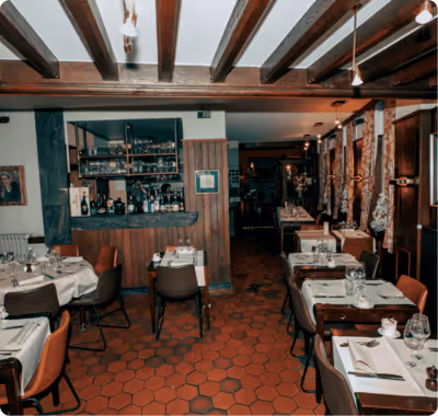 Ons restaurant is ondergebracht in een gerenoveerd pand uit de 17de eeuw met een typisch geschilderde trapgevel.