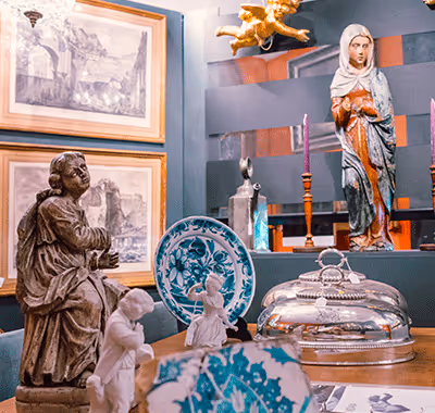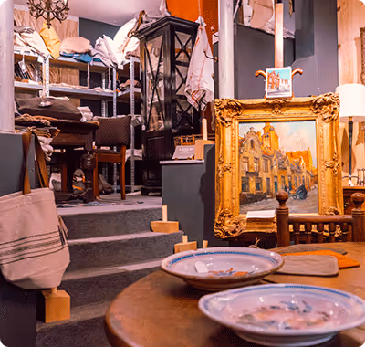 Fraaie antiekzaak met in elkaar lopende toonzalen met een totale oppervlakte van 120 m² ruime keuze aan talloze producten.