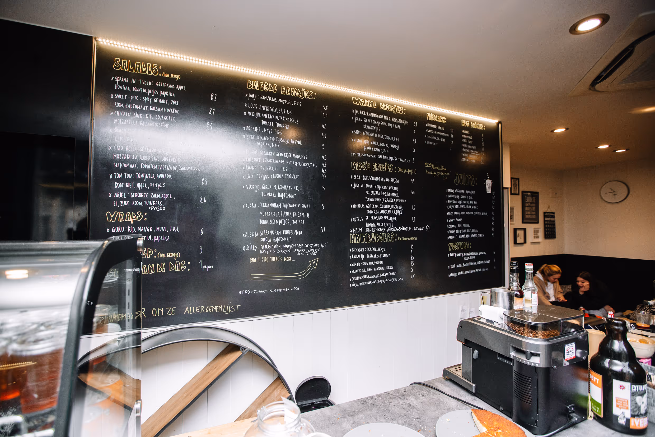 Jolly juices, kinky salades, happy bagels, beasty burgers, belegde broodjes, huisgebakken cake, wraps en soep... alles met liefde versbereid